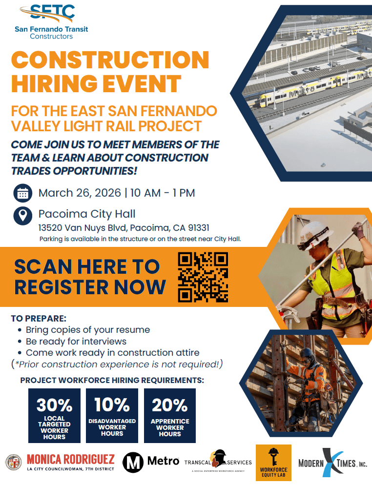 San Fernando Transit Constructors (SFTC) and Coucilwoman Monica Rodriguez invite you to participate in the Metro East San Fernando Valley Light Rail Project Construction Hiring Event.